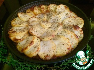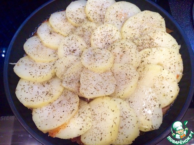 В это время отвариваем картофель до полуготовности. В мундире или без: тут кто как любит! Мы любим именно с кожурой, у него приятный привкус. Так что варим до полуготовности, охлаждаем немного, чистим, нарезаем на кругляшки, (обожаю это слово))), толщиной 1 см и немного внахлест выкладываем на наше рагу. Я переложила его в другую форму, но, если Вы делали в сковороде-то можно прямо там!