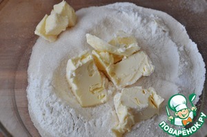 Добавляем сливочное масло комнатной температуры и всё перетираем в крошку.