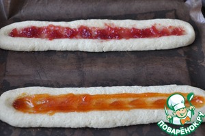 Переносим "колбаски" на противень, покрытый пакарской бумагой. Слегка приминаем, посредине делаем бороздку пальцами, но не до конца.