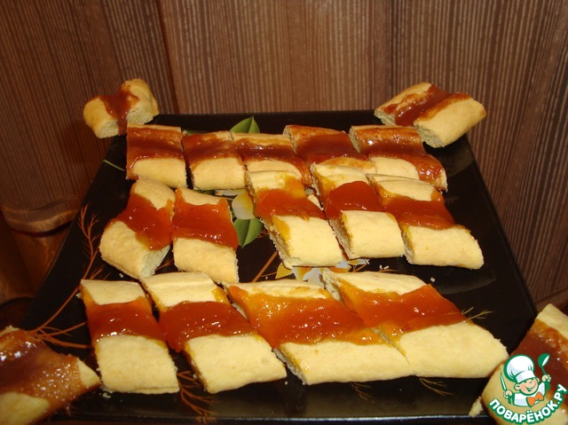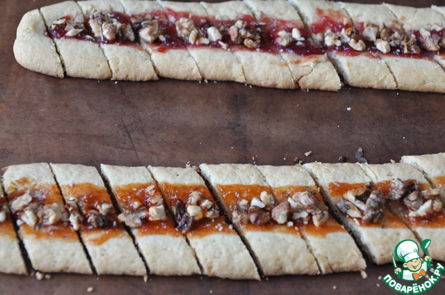 Достаём печенье, быстро промазываем бороздку джемом, у меня один персиковый, другой вишнёвый.