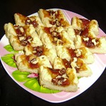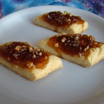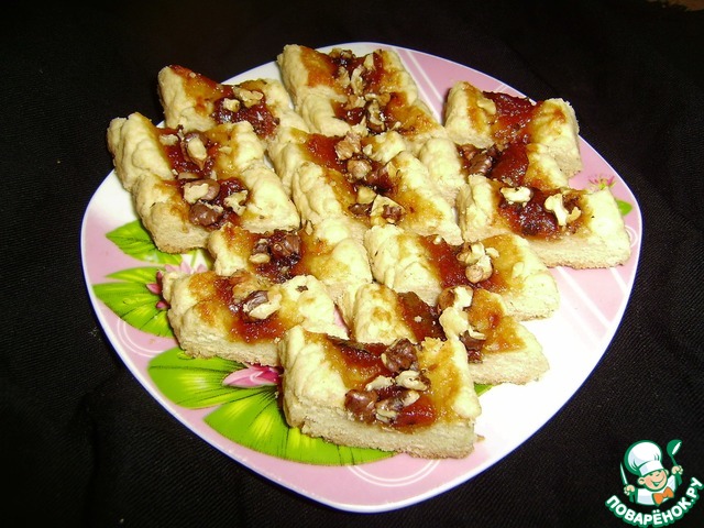 Сверху джема насыпаем слегка раздробленные орехи, у меня грецкие. Немного вдавливаем орехи в джем и опять ставим в духовку.