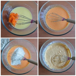В миску просеять муку, добавить сахар, соду, разрыхлитель, имбирь, корицу, душистый перец перемешать. В отдельной посуде взбить венчиком яйцо и молоко, добавить растительное масло, уксус, перемешать.