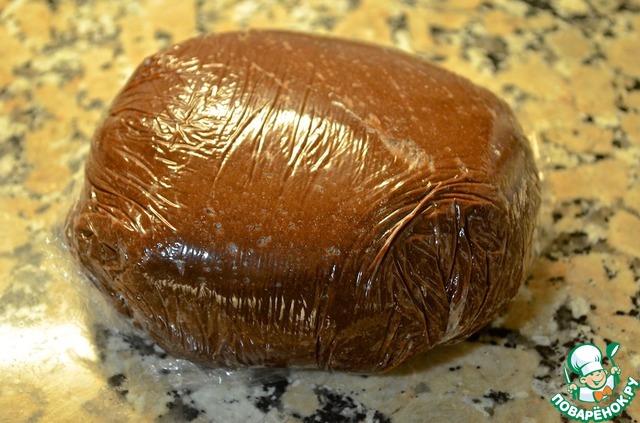 3. Добавить молотый фундук, просеянную муку и порошок какао. Хорошенько размешать, получившееся тесто завернуть в пищевую пленку и убрать в холодильник на час, чтобы одно стало более твердым.
