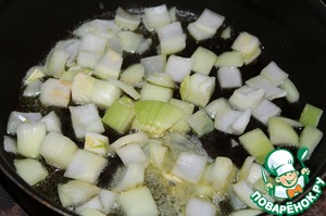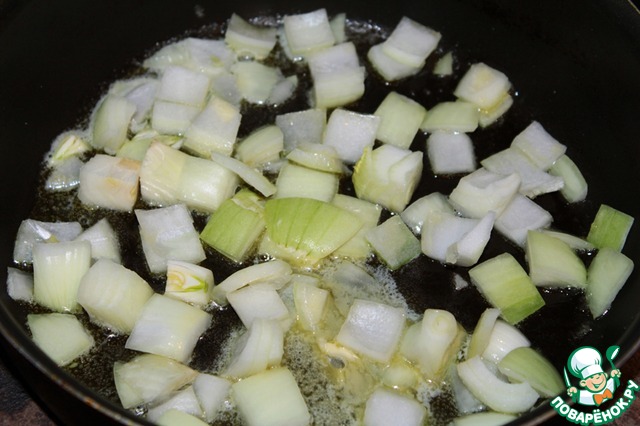 Луковицу среднего размера очистить и нарезать кубиками. Обжарить до золотистого цвета на сливочном масле (10 г).