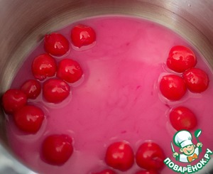 Десерт нужно подавать с вишневым соусом. Для него поместите вишню и немного сиропа из банки в кастрюлю. В небольшом кол-ве сиропа разведите крахмал и введите в кастрюлю. Варите до загустения соуса, постоянно перемешивая.
