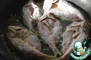 1. Рыбу почистить, разрезать вдоль спины и раскрыть как книжку. Хорошо обсушить бумажными полотенцами, посолить-поперчить, обвалять в муке.