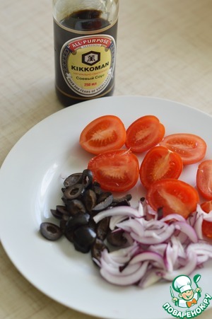 4. На сковородку добавить оставшееся масло, выложить лук, обжарить пару минут, затем помидоры, маслины, обжаривать примерно 3 минуты. в последний момент добавить базилик, можно свежий, соевый соус, перец и лимонный сок. Сразу подавать.