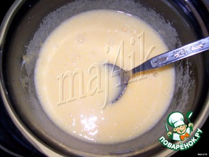 Добавить соду и мешать пару минут, пока масса не поднимется.