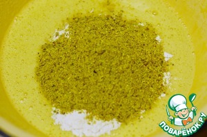 • 1. Для бисквита яйца, масло и сахар взбить миксером добела, масса немного должна увеличиться. Пшеничную муку просеять с разрыхлителем. Добавить фисташковую муку. Добавить в яично-масляную смесь. Замесить тесто, не очень густое.