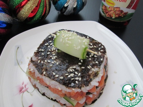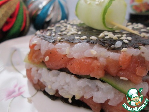 Закрываем листом нори и повторяем заново. Завершающим слоем должен быть лист нори