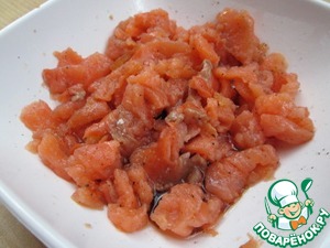 Филе рыбы мелко порезать, добавить немного растительного масла, черного перца и соевый соус, перемешать