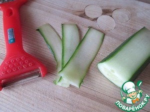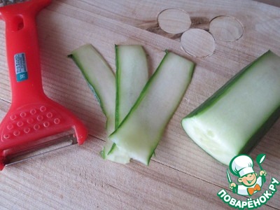 Огурец нарезать полосками, это удобно сделать овощечисткой