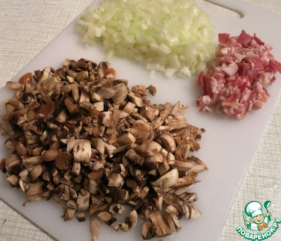 Для начинки мелко рубим половину серединок лука, грибы, бекон (предварительно отложив в сторону 6 полосок)