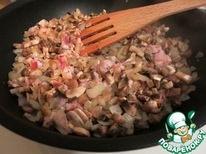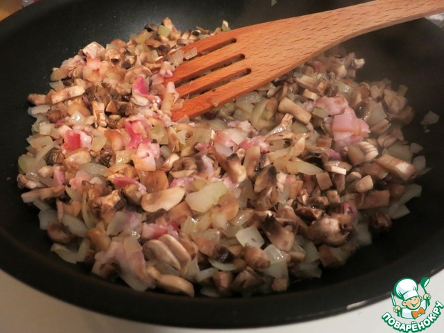 Поджариваем лук до прозрачности, добавляем грибы, нарезанный бекон, и жарим еще пару минут.