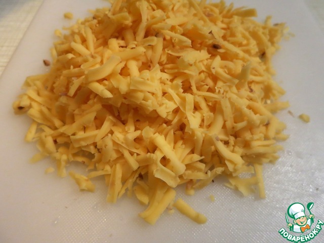 Натираем сыр и отправляем 2/3 в сковороду с начинкой.