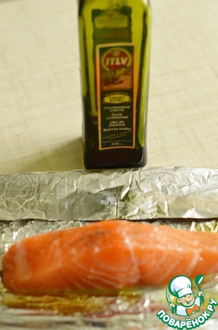 3. С рыбы снять кожу, удалить кости, посолить, поперчить, сбрызнуть оливковым маслом. Рыбу завернуть в фольгу и запечь в разогретой до 180С духовке 10 минут.