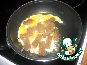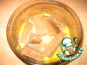 Режем произвольными брусочками бород. хлеб, добавляем его к взбитым яйцам, чтобы пропитался...