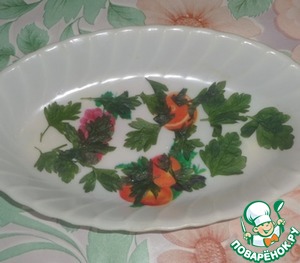 Красивые листья петрушки укладываем на дно формы для заливного. Формой может быть любая тарелка, но желательно продолговатая.