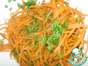 Морковь потереть на тёрке для корейской моркови, добавить зелень, уксус, воду и сахар. Дать постоять.