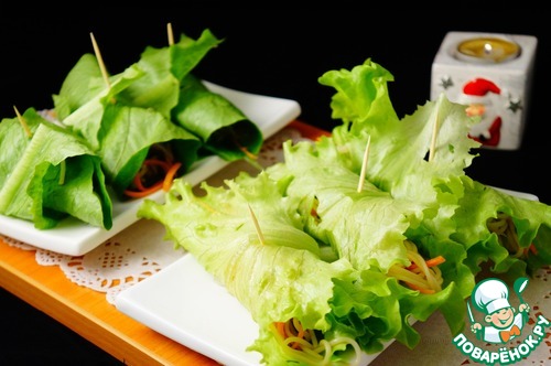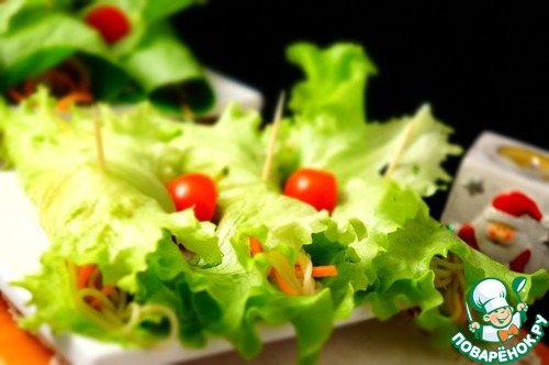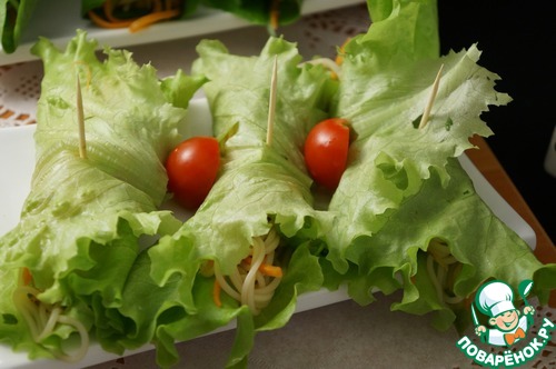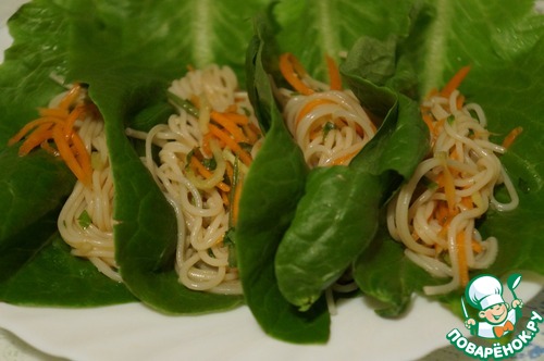 Острый салат с рисовой лапшой в зеленых рулетиках. Увидела этот рецепт в кулинарном блоге и не смогла пройти мимо. Просто, но вкусно и эффектно. Вегетарианское блюдо вьетнамской кухни. Спасибо Эдуарду за рецепт. Используется два вида соевого соуса от Киккоман.