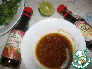 Смешать ингредиенты для заправки: терияки, соевый и вустерский соусы, имбирь, чили, чеснок, сок лайма, масло растительное. Дать настояться.