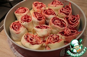 Клюкву равномерно разложит на тесто. Я клюквенное пюре немножечко приляпывала ладошкой. Свернуть рулет.