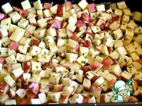 4. Выложить картофель на противень и запекать в духовке при температуре 200С 40 минут, не размешивая. Затем чуть встряхнуть противень, очень аккуратно размешать металлической лопаткой и вернуть в духовку еще на 20 минут. Время и температура зависят от вашей духовки. Кубики картошки должны быть хрустящими снаружи и мягкими внутри.