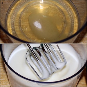 Взбить в крутую пену белки с 50 г. (+50 г. для сладкоежек) сахарного песка.
