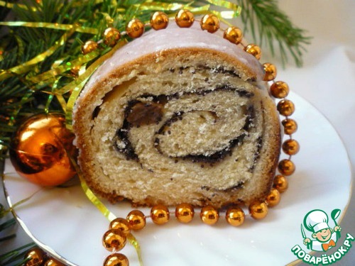Форму для венка смазываем маслом и укладываем рулет швом вниз. Оставляем еще на 20 минут подходить его в форме. Выпекаем в духовом шкафу при температуре 190 градусов минут 45-50. Готовый венок перекладываем на решетку и даем остыть. Смазываем глазурью из сахарной пудры и лимонного сока.