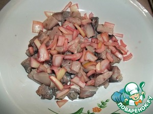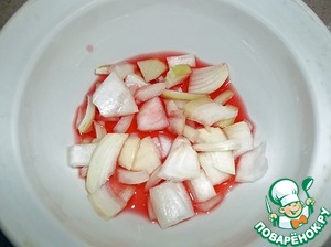 Лук мелко нарезать и, по желанию, ошпарить кипятком, или, как я, замариновать на несколько минут в 1ст. л. 5% винного уксуса, смешанного с 1ч. л. сахара.