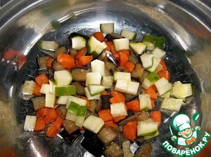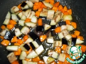 Баклажан и морковь нарезать небольшими кубиками. У меня баклажан свежий, кожицу не снимала. Баклажан посолить и оставить на 10-15 минут. Затем разогреть немного растительного масла в сковороде и обжарить сначала кубики моркови (минут 5), затем добавить кубики баклажана. Жарить, помешивая до готовности овощей, еще минут 5 (сильно зажаривать не надо, ) Осторожно вынуть овощи со сковороды, избегая излишков масла.