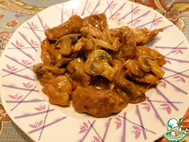 Теперь добавляем соевый соус, сахар и вино. Провариваем еще 5 мин. В воде разводим крахмал и вливаем в мясо постоянно помешивая. Как только соус загустеет выключаем огонь и даем постоять под крышкой еще минут 5 мин.