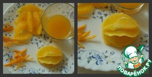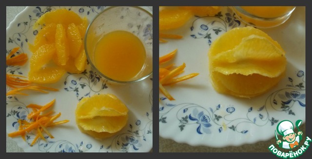 Апельсины тщательно моем. Целый апельсин очистить от кожуры (срезая кожуру ножом как у яблока, до мякоти). Вырезать дольки между пленками, удаляя косточки. Из второго отжать сок. Из этих остатков получится вкусный компот. Вот почему мы тщательно мыли апельсины.