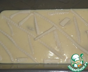 Тесто выливаем в смазанную растительным маслом форму и по желанию украшаем пирог кусочками слоеного теста. Можно обойтись и без него. Посыпаем пирог кунжутом.