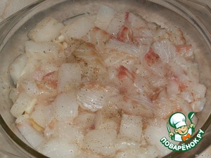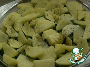 Следующим слоем выложить рыбу, которую заранее нужно посыпать приправой.