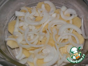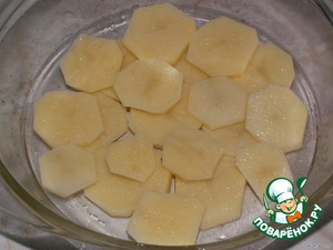 В форму для запекания самым нижним слоем выложить половину картофеля, посолить.