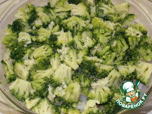 Брокколи (у меня была замороженная) подержать немного в тeплой воде, у соцветий отрезать толстые ножки. Использоваться будет только верхняя часть.