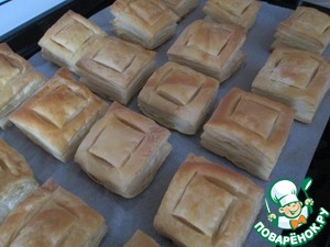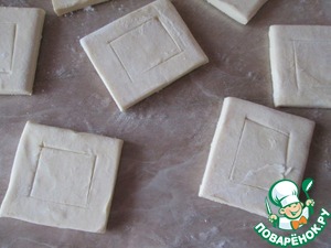 Слоеное тесто, не раскатывая, нарезать примерно на такие кусочки. У меня с одного листа получилось 9 штук, всего 18