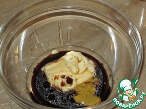 Готовим маринад. Смешать в миске соевый соус (у меня сладкий, если вы используете обычный, то положите 0,5 ч. л. сахара), майонез, растительное масло и горчицу