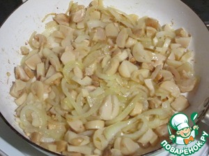 Обжариваем немного на растительном масле лук и добавляем к нему грибы