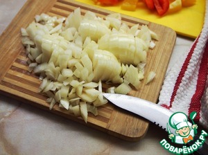 Нарезать на крупные кусочки болгарский перец и немного помельче репчатый лук.