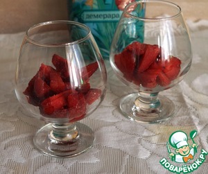 Клубнику, не размораживая разрезать на 2-4 части, сложить в креманки или бокалы.