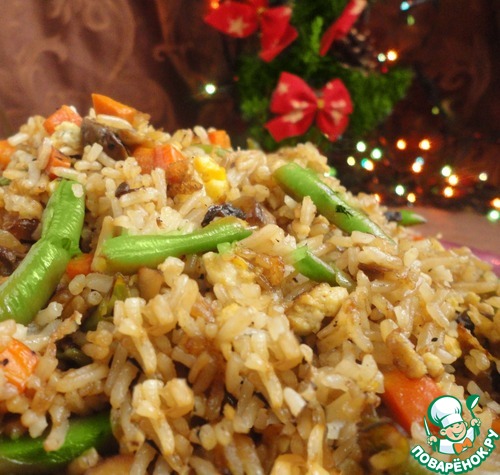 В основе этого рецепта лежит принцип приготовления классического китайского блюда - жареного риса. Но от классической технологии есть некоторые отступления, поэтому принадлежность к китайской кухне я писать не буду. На самом деле классический рецепт я приспособила под имеющююся у меня посуду для приготовления и под вкусы моих домашних. Это очень хороший вариант гарнира для новогоднего стола. Часто на гарнир в Новый Год готовят картофельное пюре, т. к. его можно приготовить без лишних заморочек и подать на стол в компании более изысканых закусок и горячих блюд. Но пюре - как-то скучно. Плюс гарнира, который я предлагаю в том, что для него можно заранее подготовить все продукты и оставить их практически до момента подачи. Далее приготовление займет буквально 10-15 минут и можете удивлять своих гостей вкуснешим гарниром!