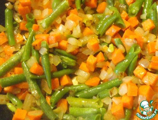 Далее горсть замороженой стручковой фасоли. Все вместе немного прожариваю и вынимаю из сковороды. Набор овощей можно варьировать.