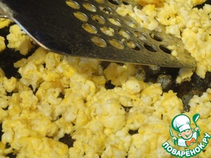 Когда придет время, разогреваем сковороду, наливаем растительное масло, разбиваем два яйца (на представленное количество риса) и быстро перемешивая на сильном огне превращаем яйцо в такую себе омлетную крошку. Яйца вынимаем из сковороды.