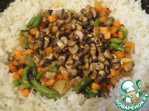 Отгребаем рис на края (почти как в классической технологии) и выкладывам в середину овощи и грибы. Помешивая жарим еще пару минут.