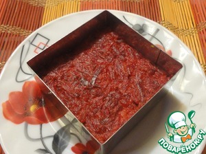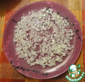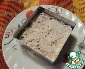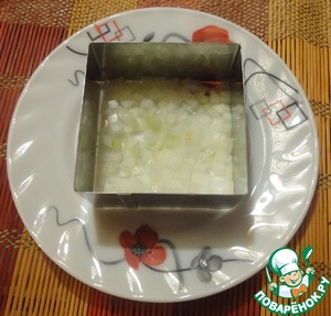 Но я решила воспользоваться подаренной мне Наташей (Pingvin72) формочкой для порционных салатов. Вообще, все последние рецепты у меня выходят посвященными ей, т. к. активно пользуюсь содержимым ее мне подарка. Итак, мы отвлеклись. Первый слой лук.