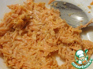 Далее морковвь. Морковь сама посебе сочная, поэтому на нее хватит 2/3 столовых ложек майонеза.