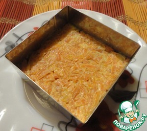 Подсаливать этот слой я советую уже солью, т. к. где-то читала, что для европейских вкусов сочетание соевого соуса с морковью не очень. Хоть в майонезе и есть соевый соус, эксперементировать не стала и пользуюсь солью. Опять же перед тем, как солить, пробуем, т. к. майонез соленый, ну и сама сельдь у Вас тоже может быть сильно соленой.
