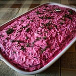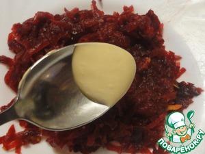 Далее свекла. Это самый сочный овощь. Потому тут вполне хватает 1/3 столовой ложки майонеза. Ну в крайнем случае - 1/2 ст. л. Из тех же соображений (чтобы не добавлять лишней жидкости), я и тут использую соль. Солим сначала немного, пробуем, при необходимости - досаливаем.